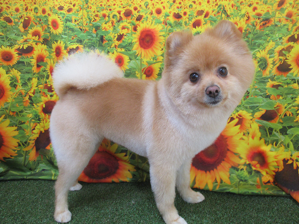 ポメラニアン カットコースハサミで出来るだけ短く丸くカットしました